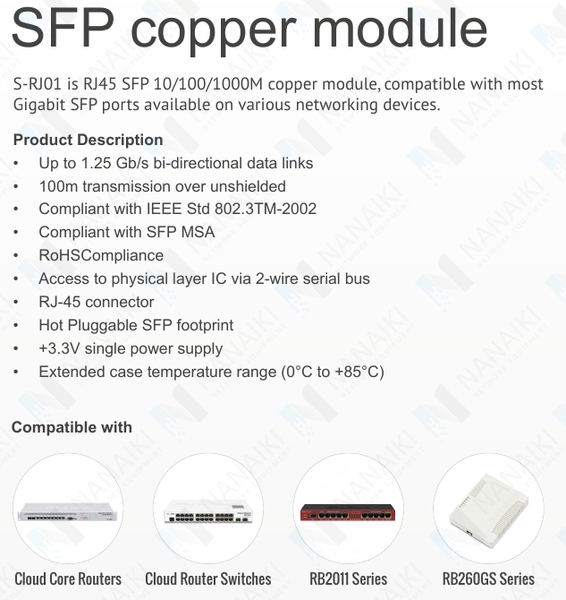 | Дополнительная информация | S-RJ01 не совместим с SFP + портами в следующих моделях: CCR1036 / CCR1016 / CCR1009 / CRS226 |